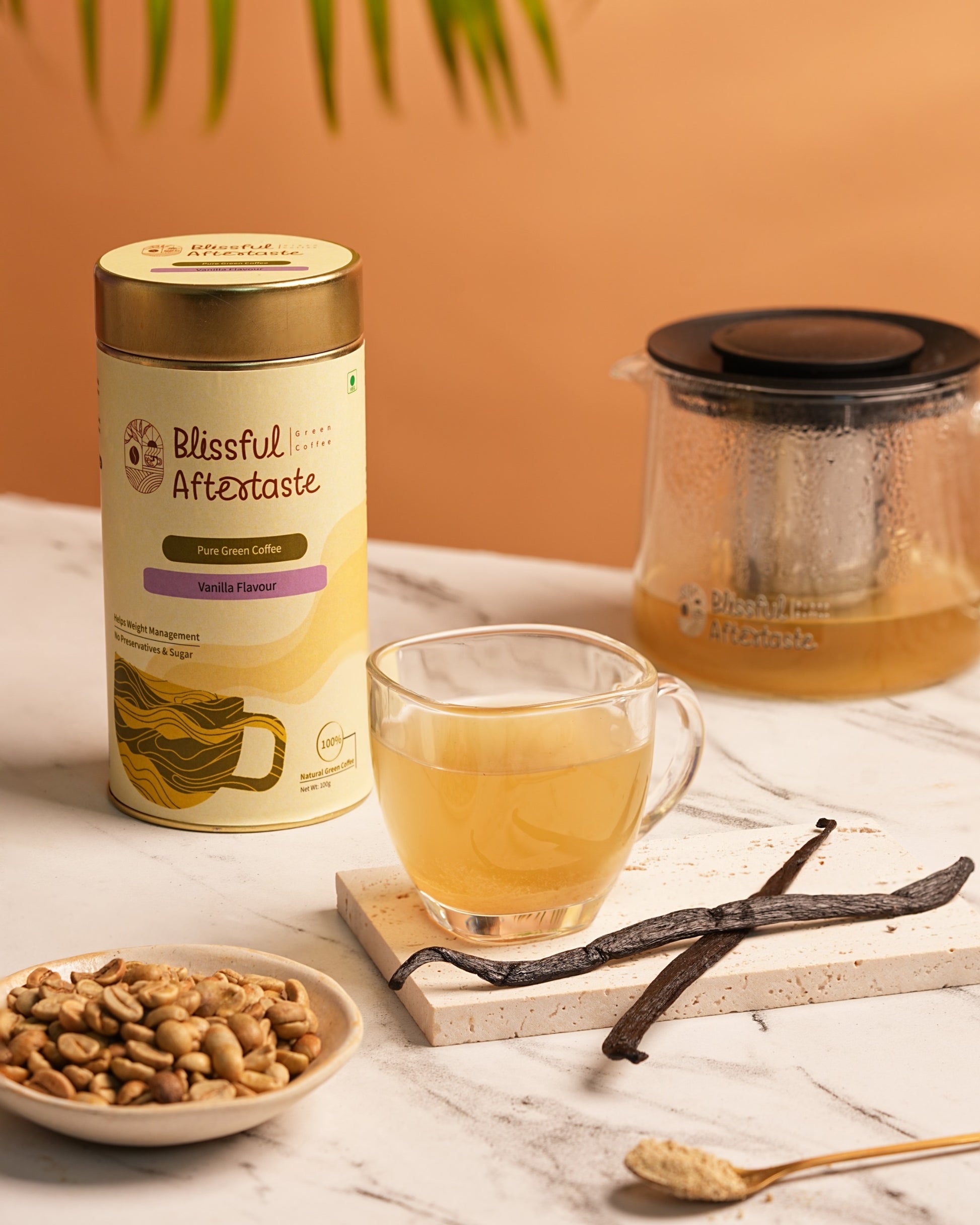 Blissful Aftertaste Vanilla Flavoured Green Coffee Powder delivers a perfect blend of health and taste — with zero preservatives or artificial additives. Made from unroasted green coffee beans, it retains natural antioxidants and chlorogenic acid to support energy, metabolism, and overall wellness.